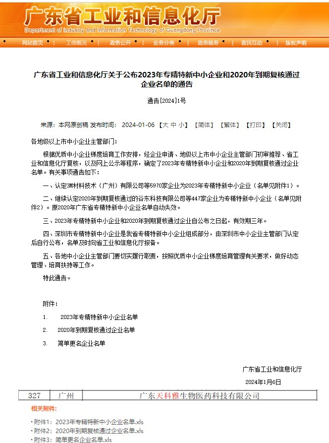 2024年1月6日,廣東省工業(yè)和信息化廳公示2023年專精特新中小企業(yè)名單,經(jīng)過市區(qū)推薦,合規(guī)審查,專家評審等,天科雅榜上有名,喜獲廣東省“專精特新”中小企業(yè)認(rèn)定。