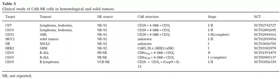 ▲ CAR-NK細(xì)胞在血液瘤和實體瘤中的臨床研究